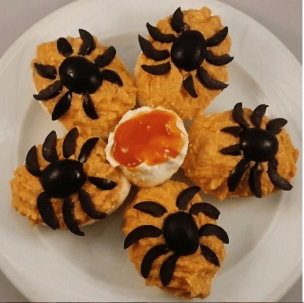- Cocemos los huevos en agua con sal durante unos 10 minutos, los pelamos con cuidado y los partimos por la mitad, separando las claras de las yemas. En un bol machacamos todas las yemas y añadimos el atún y la salsa de tomate. Rellenamos las claras con la mezcla. Para hacer las arañas cortamos las aceitunas negras por la mitad, una mitad hace de cuerpo y la otra mitad para las patitas de las arañas (cortándola en 8 trazos alargados).