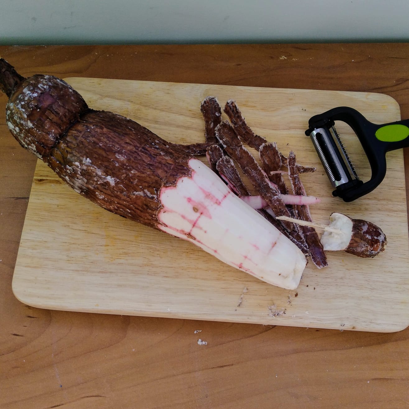 Pela con ayuda de un pelador la raíz, hasta obtener la parte blanca. Es importante eliminar muy bien la corteza.