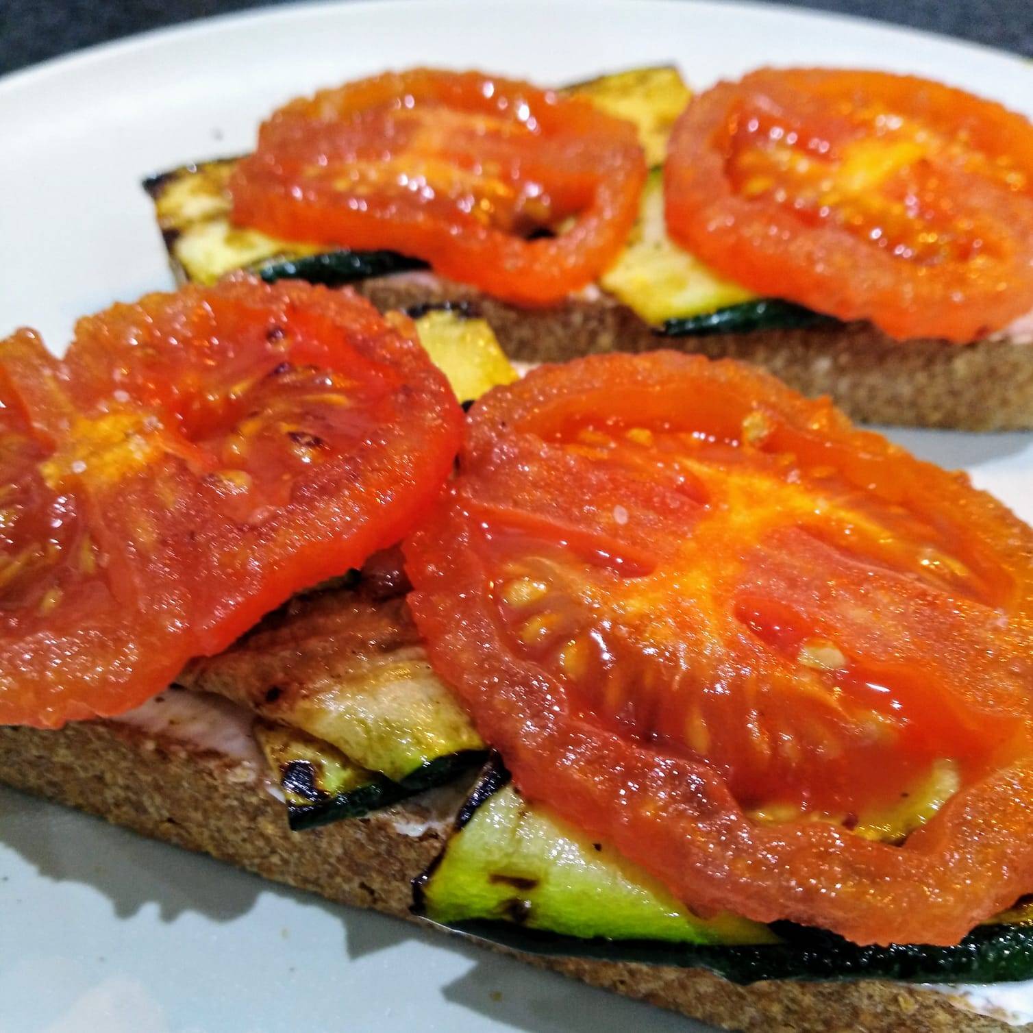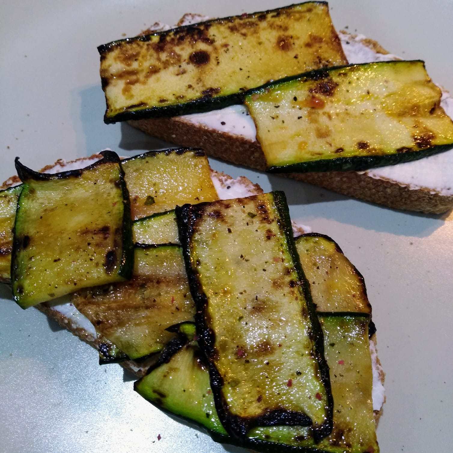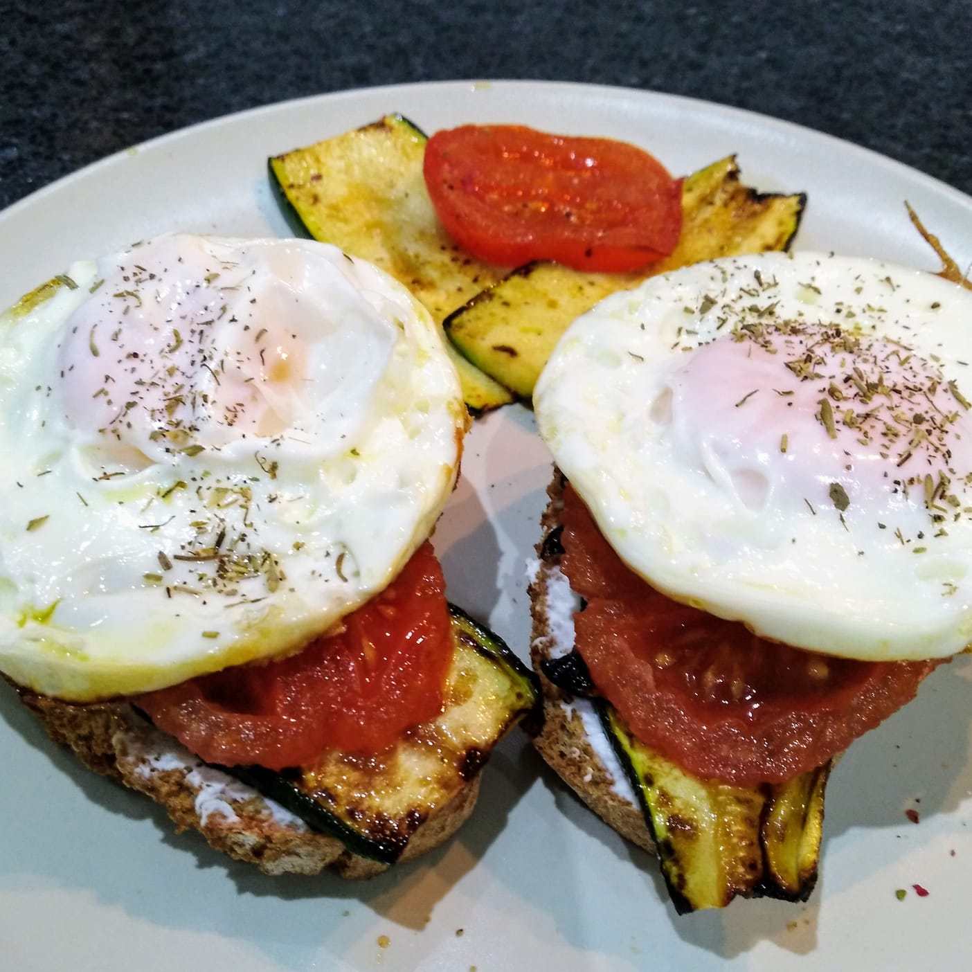 Unta un poco del queso en las rebanadas de pan integral, añade encima las tiras de calabacín y las rodajas de tomate a la plancha, un poco de sal y pimienta negra y por último el huevo a la plancha con un poco de orégano.