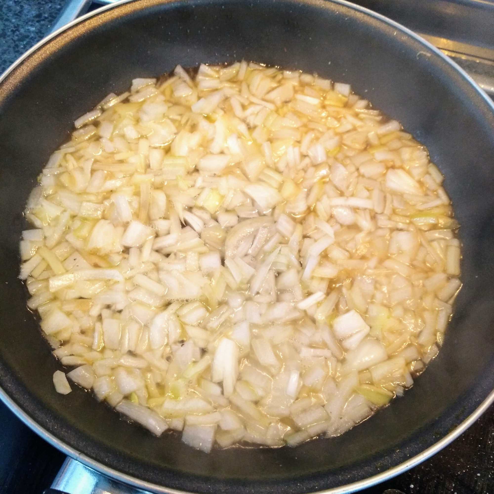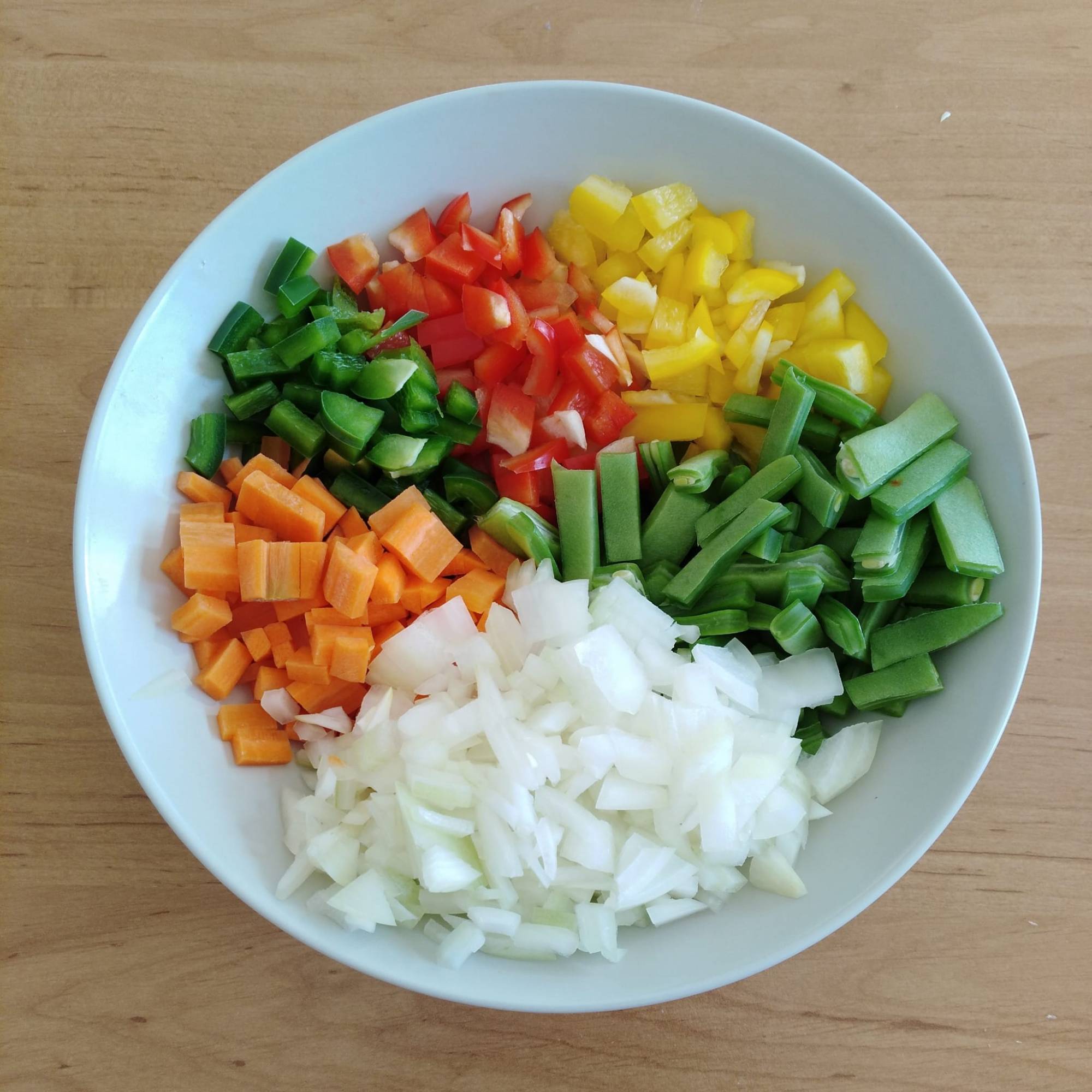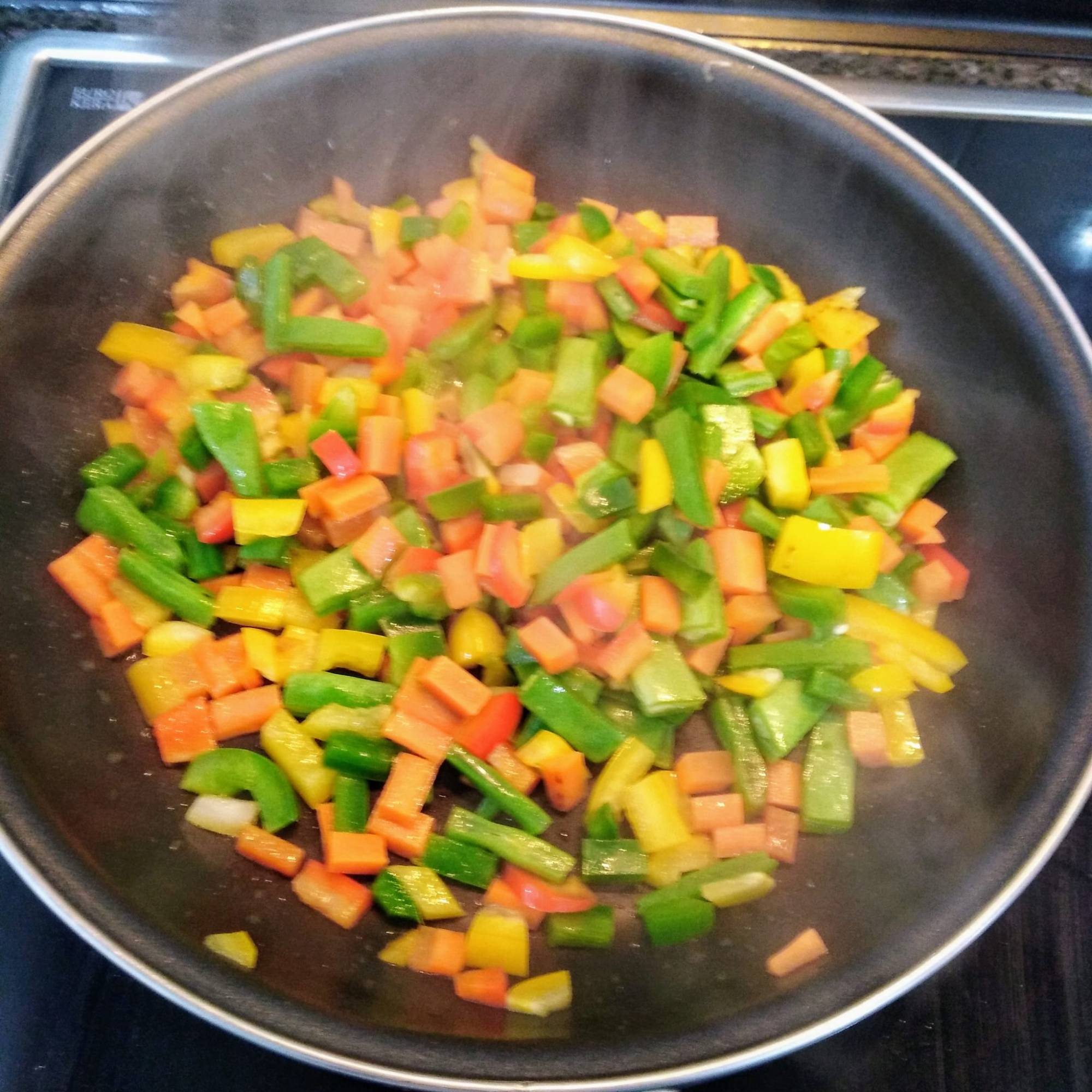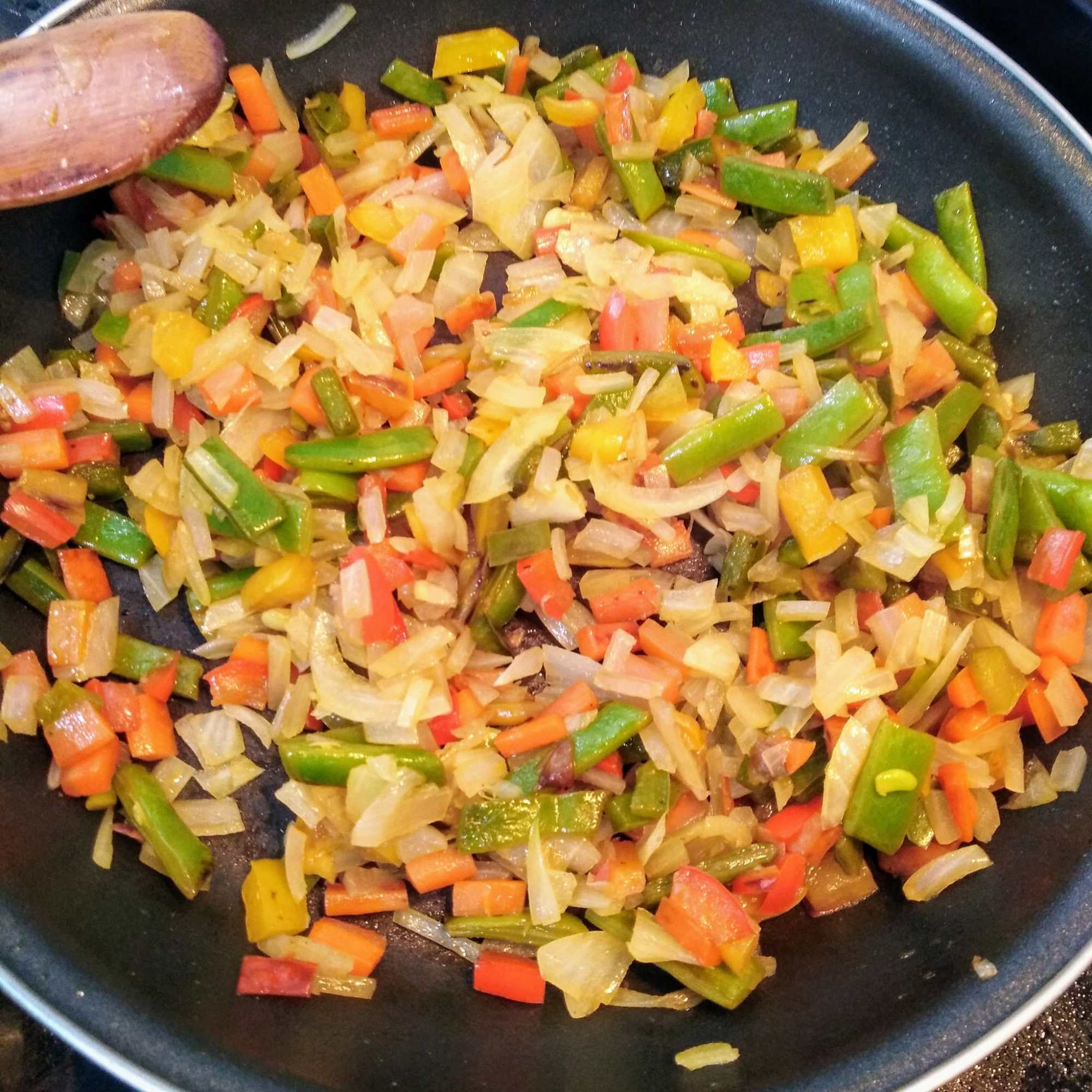 Saltea las verduras (excepto la cebolla) en una sartén con un poco de AOVE y sal, remueve de vez en cuando hasta que se doren.