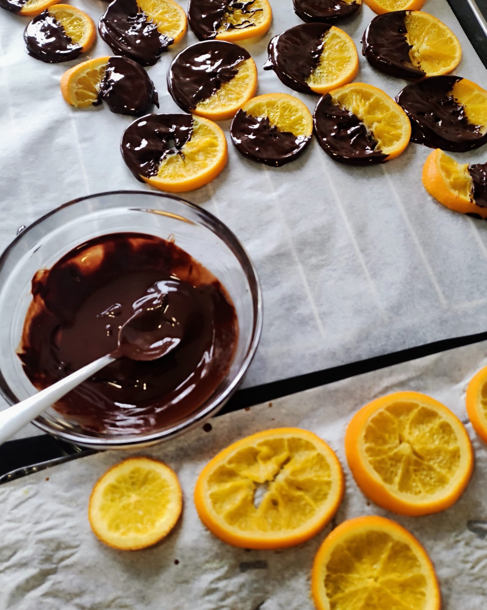 Por último, cubre la mitad de las naranjas con chocolate y deja enfriar en la nevera hasta que el chocolate se endurezca.