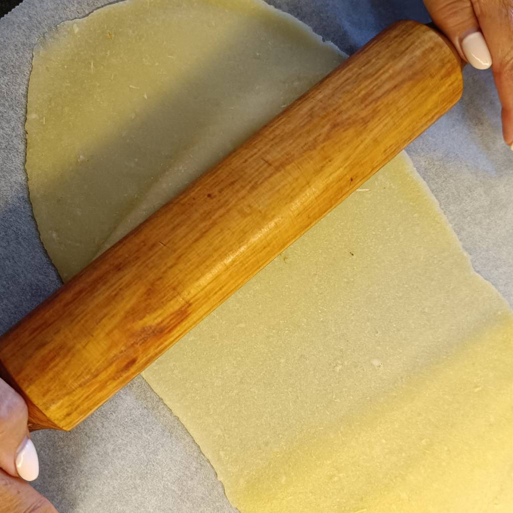 *Si no tienes rodillo también puedes estirarla poniendo encima otro papel vegetal y dejando rodar un vaso de tubo o botella por encima.