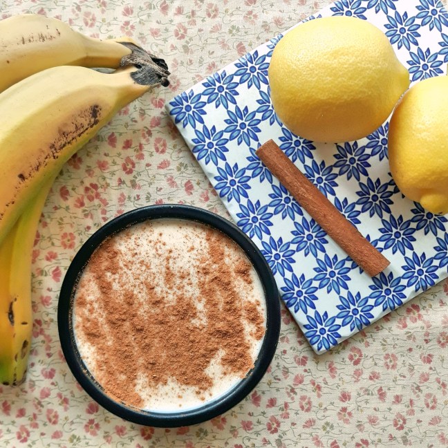Un batido completo, con yogur, plátano y leche coco...