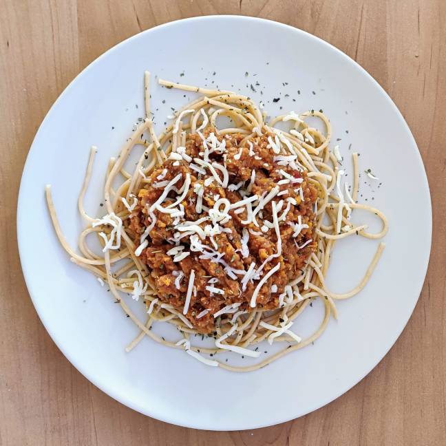 Pasta fresca casera, con tomate y orégano, ideal para acompañar con soja texturizada